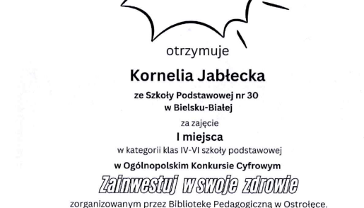 Nasza uczennica Kornelia Jabłecka z kl.6b zdobyła I miejsce w Ogólnopolskim Konkursie Cyfrowym ZAINWESTUJ W SWOJE ZDROWIE w kategorii klas...