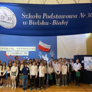 W dniu wczorajszym odbyła się uroczysta akademia z okazji Narodowego Święta Niepodległości przygotowana przez uczniów klasy 6a i 6b pod opieką wychowawczyń – pani Klaudii Sierackiej i pani Agnieszki Dąbrowy.