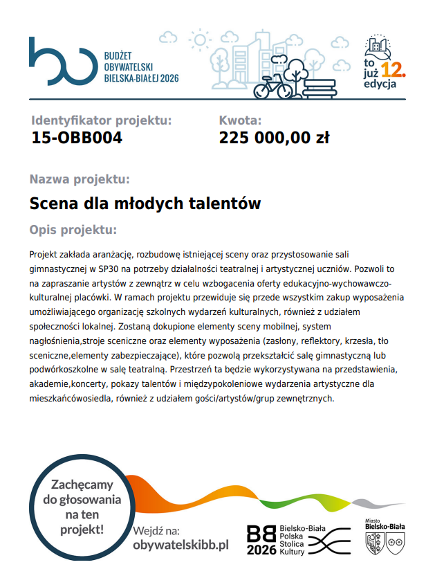 👉 Projekt zakłada aranżację i rozbudowę istniejącej sceny oraz przystosowanie sali gimnastycznej w SP30 do potrzeb działalności teatralnej i artystycznej uczniów. Dzięki temu powstanie nowoczesna przestrzeń, która umożliwi organizację występów młodych artystów, a także zapraszanie gości i grup z zewnątrz, wzbogacając ofertę edukacyjno-wychowawczo-kulturalną szkoły i całej społeczności lokalnej.