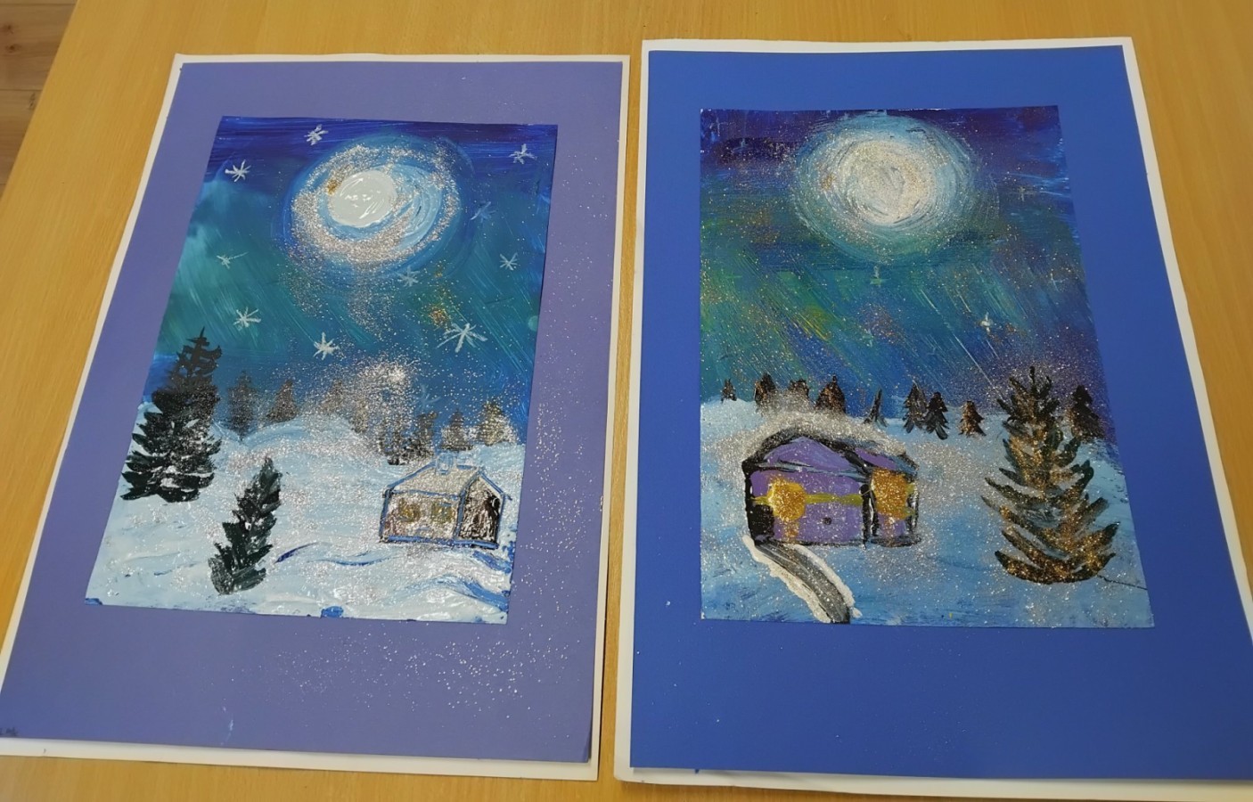 Na kółku uczennice z kl. 4 - Pocięgiel Emilia oraz Aleksandra Kocur wykonały: „Zimowy krajobraz nocą” - namalowały zimowy pejzaż nocą z wykorzystaniem farb plakatowych, nauczyły się jak stworzyć poświatę otaczającą Księżyc, efekt zorzy na niebie, a wszystko wzmocniły brokatem.
